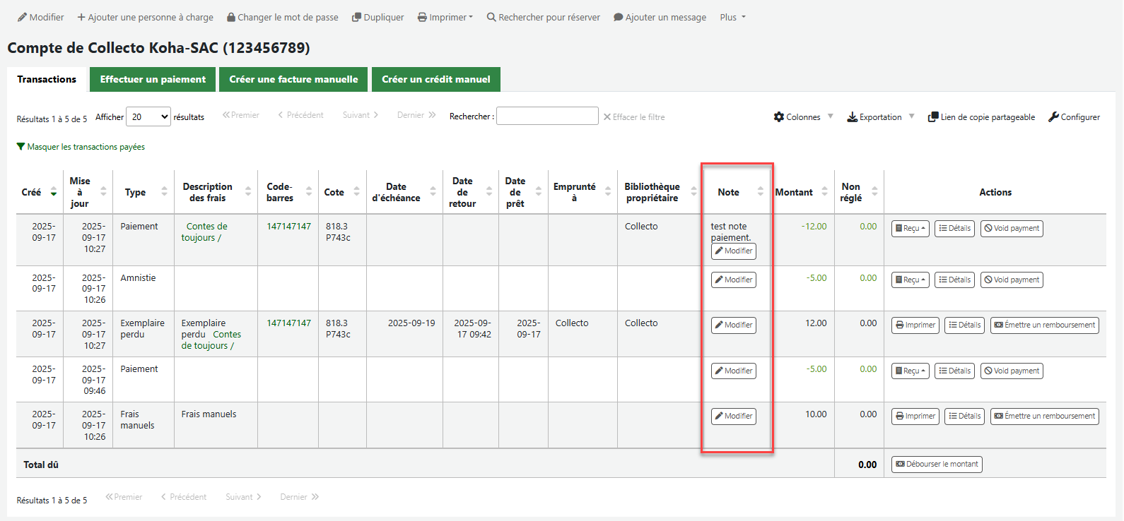 - Cette amélioration permet désormais d'ajouter des notes sur toutes les actions du tableau des transactions de l'interface du personnel. Les employés peuvent désormais ajouter des notes lors de l'application de remises, du paiement d'amendes individuelles, de l'annulation d'amendes individuelles, de l'émission de paiements, de l'annulation de paiements, de l'émission de remboursements et de l'annulation de frais. https://bugs.koha-community.org/bugzilla3/show_bug.cgi?id=23674