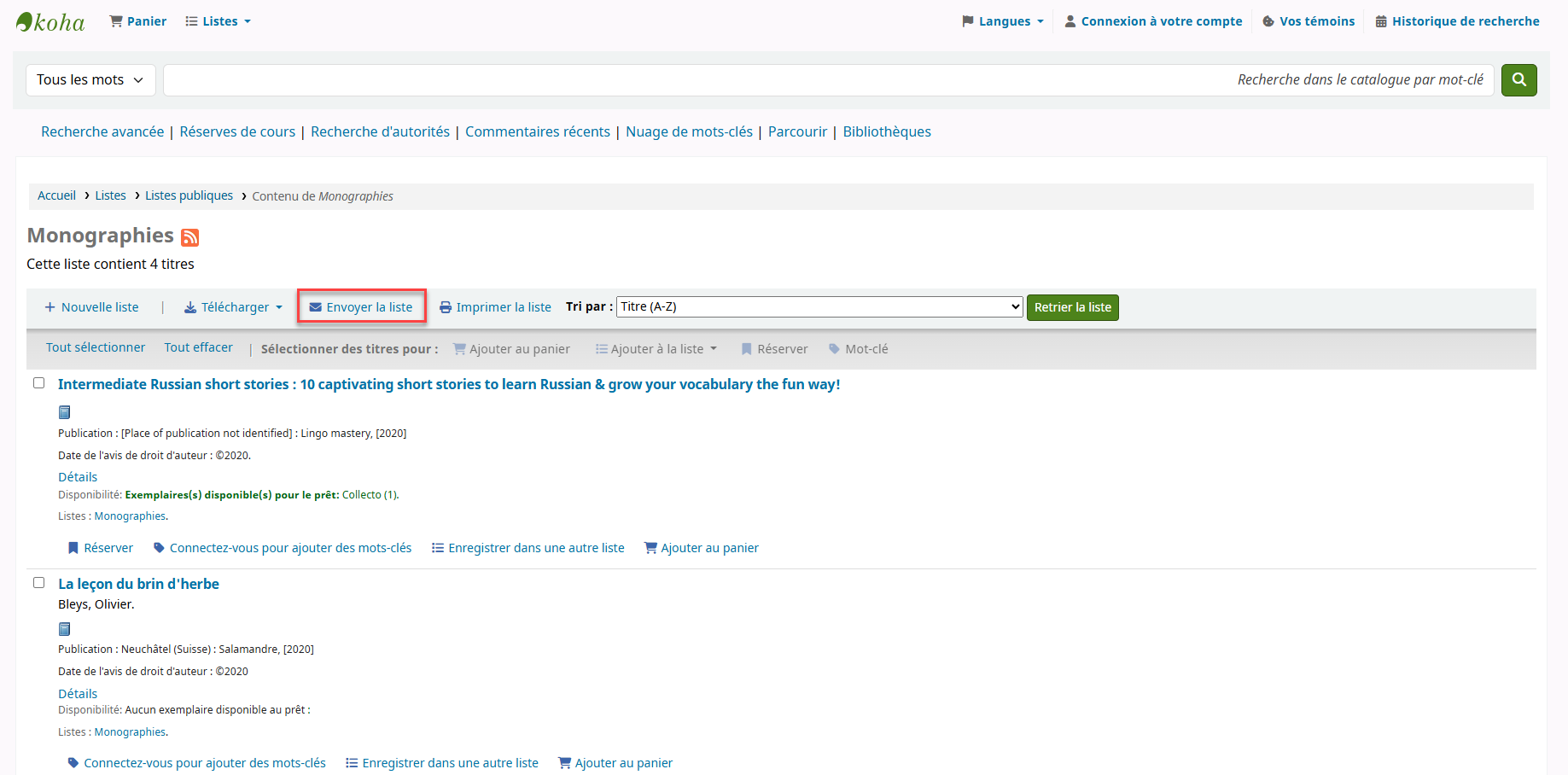 - La nouvelle préférence système « OPACDisableSendList » offre aux bibliothèques la possibilité de désactiver la possibilité d'envoyer des listes depuis l'OPAC et masquer le lien « Envoyer la liste ». https://bugs.koha-community.org/bugzilla3/show_bug.cgi?id=39374