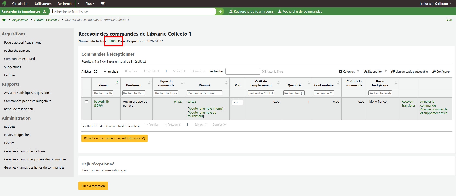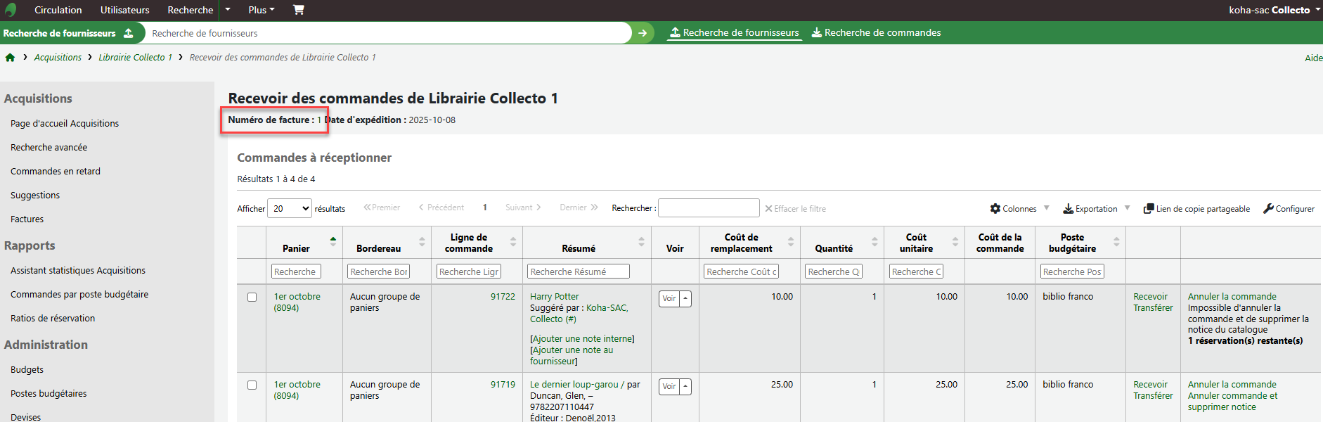 - Cette amélioration lie le numéro de facture sur la page de réception des commandes à la page de facture. https://bugs.koha-community.org/bugzilla3/show_bug.cgi?id=8855