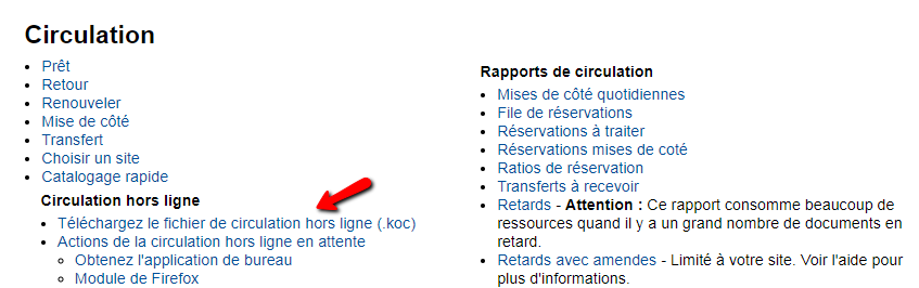Dans Koha, dans le module Circulation, cliquez sur Télécharger le fichier de circulation hors-ligne