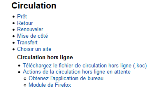 Ce module, une fois installé sur votre navigateur, permet d’enregistrer des transactions de circulation lorsque vous n’avez plus accès à internet (ce qui reste rare quand même) et de pouvoir une fois la connexion revenue les charger directement dans Koha.