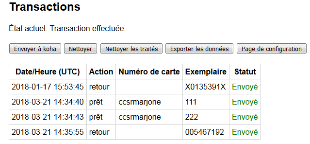 Dans le pavé des Transactions, la liste des transactions que vous avez effectuées est affichée. Dans la colonne statut, le terme Local indique que les informations n’ont pas été encore envoyées à Koha.