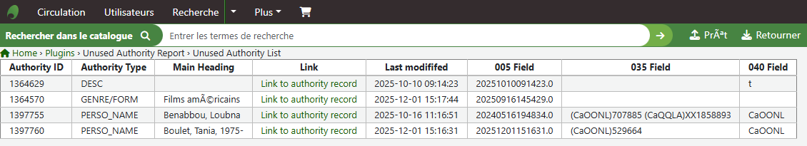 Le lien Link to authority record mène à l’autorité dans le module Autorités.
