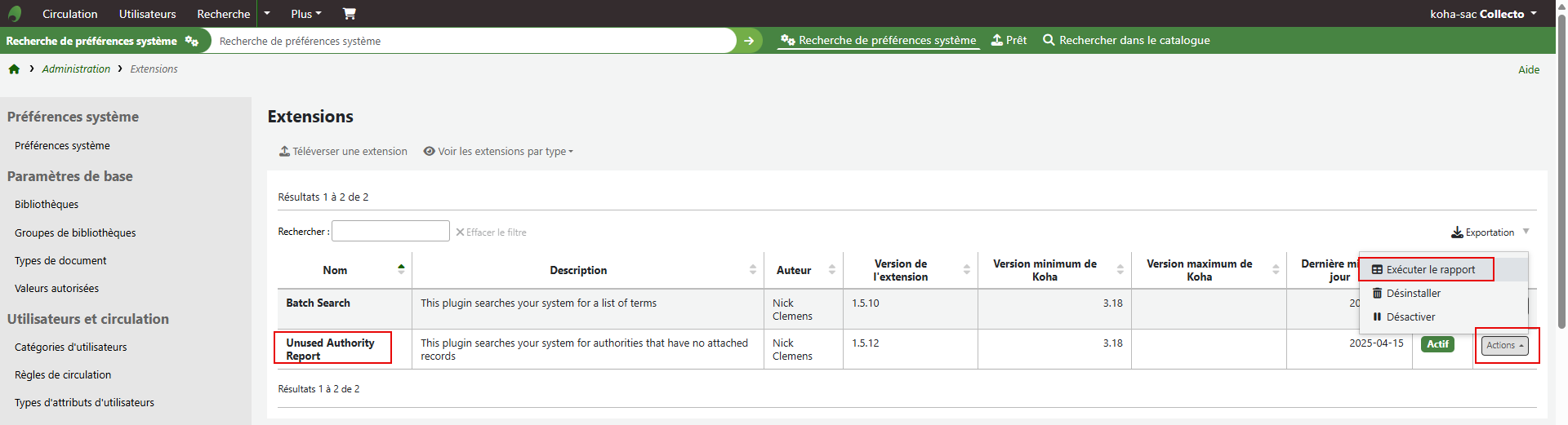 Dans la liste des plugins, dans la ligne concernée, cliquer sur le bouton [Actions] et sélectionner [Exécuter le rapport].