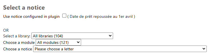 Il sera cependant toujours possible pour le personnel de la bibliothèque de placer une réservation pour une salle à partir de l'intranet pour un utilisateur faisant partie d'une catégorie restreinte. La restriction va seulement faire en sorte que l'utilisateur ne verra pas le plugin à l'OPAC.