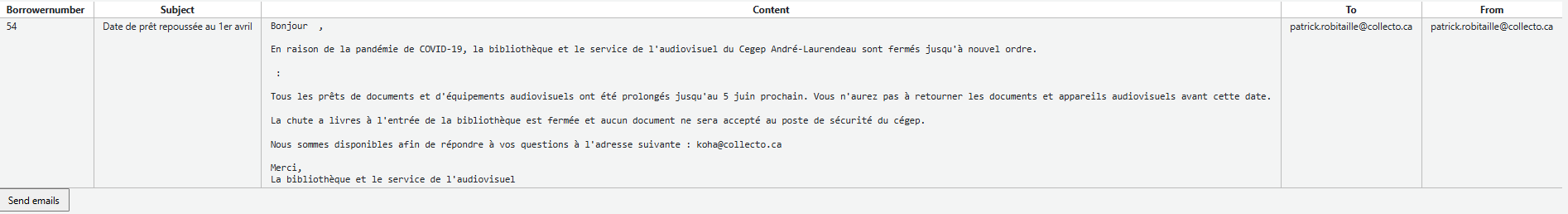Par exemple, si on veut envoyer un courriel aux usagers ayant un prêt en cours, voici une requête possible :