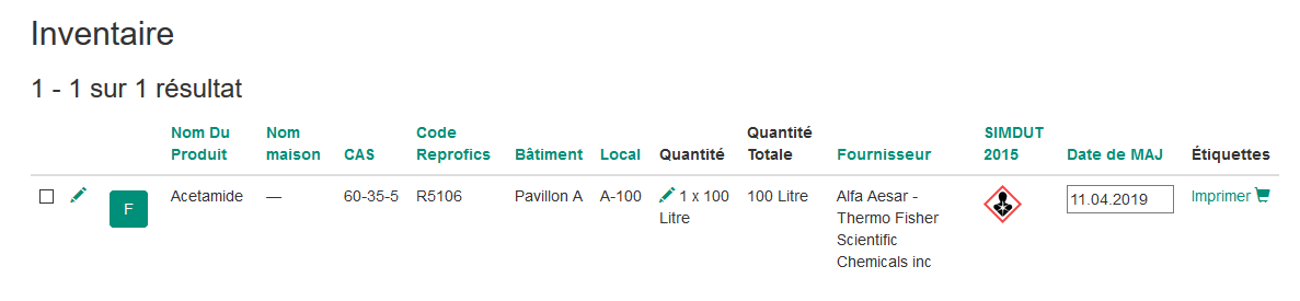 Ainsi, nous constatons que l’acétamide, le total est de 100 litres alors que nous souhaitions conserver 150 litres de ce produit en inventaire.