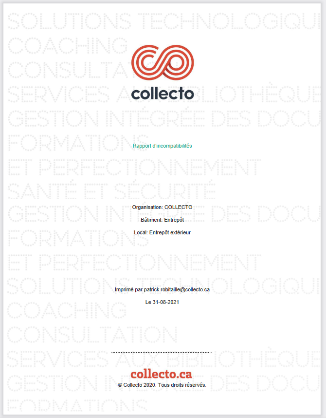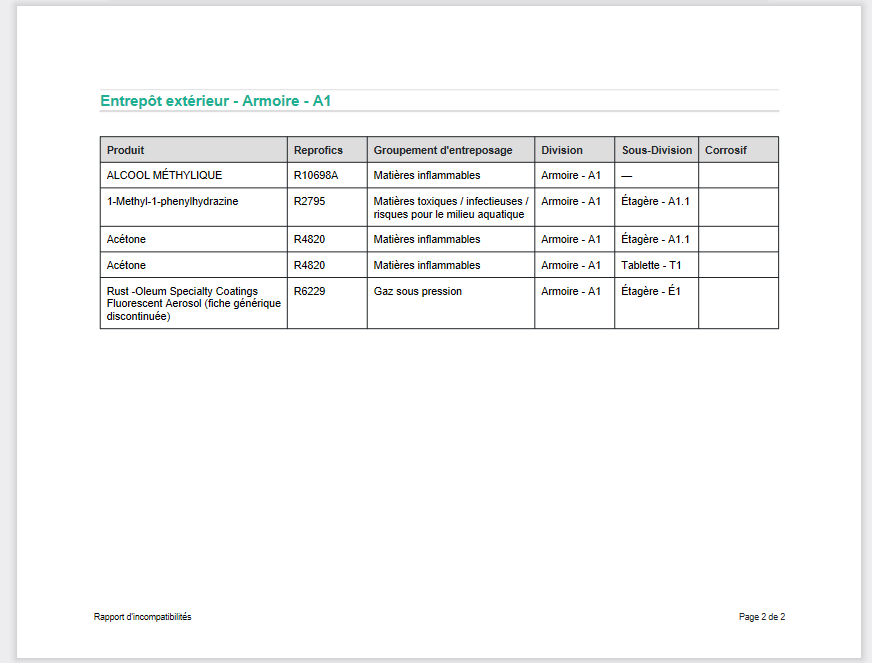 Le rapport d'incompatibilité tient compte des 31 classes de danger du SIMDUT 2015 et regroupe automatiquement les produits dangereux en 14 groupes d’entreposage qui permettent d’éviter les principaux risques d'incompatibilité.