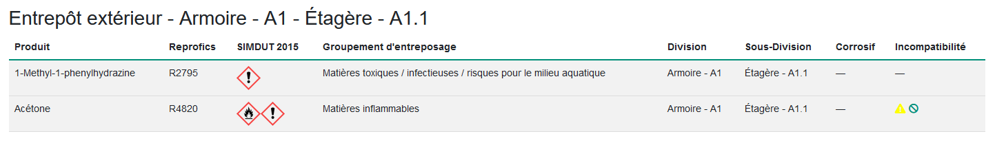Aussi, cette application peut détecter s'il y a une incompatibilité entre un produit de type acide et un produit de type base. Cette information est contenue dans le champ Corrosif de la fiche de l'inventaire du produit.