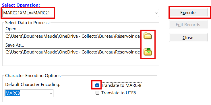 À l'aide de MarcEdit, modifier le type de fichier pour le mettre en format MARC. Cliquer sur [MARC Tools]. Dans la fenêtre qui s'ouvre, sélectionner et compléter les options indiqués en rouge.