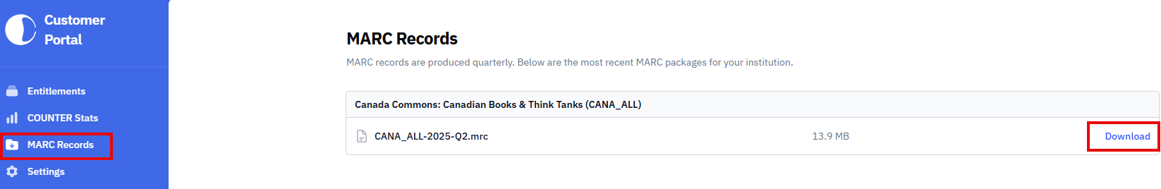 Pour avoir accès aux fichiers de notices MARC21 de Canada Commons, vous devez vous connecter à votre compte administrateur en accédant à ce site web : https://customer.coherentdigital.net/