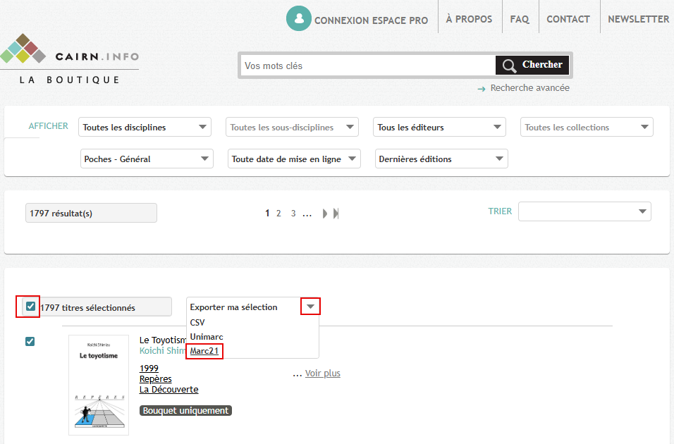Pour extraire les notices, cliquer dans la case pour sélectionner tous les titres de la liste. Ensuite, cliquer sur [Exporter ma sélection > Marc21].