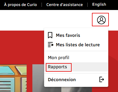 Vous devez vous connecter à votre compte administrateur de Curio pour pouvoir avoir la possibilité, dans le menu associé à votre compte, d'accéder à la création de rapports de notices.