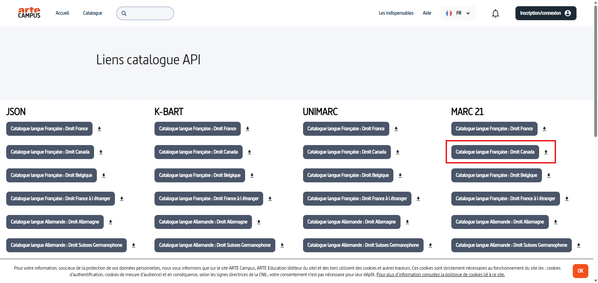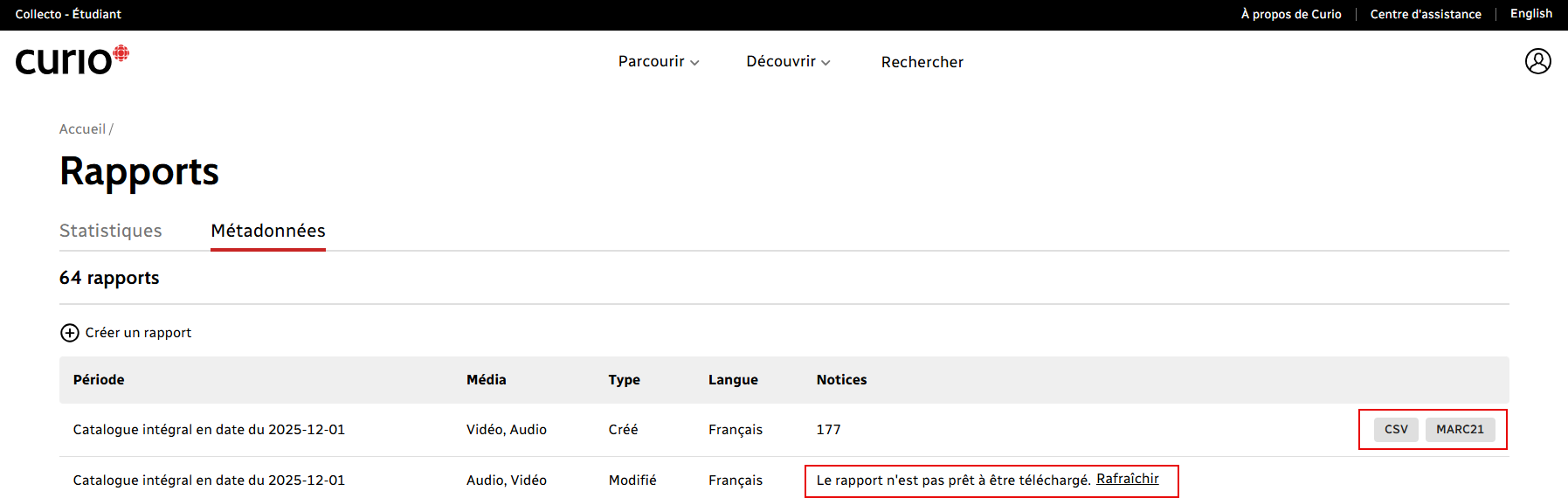 Une fois le rapport prêt, vous pouvez télécharger le fichier en format CSV ou MARC21.