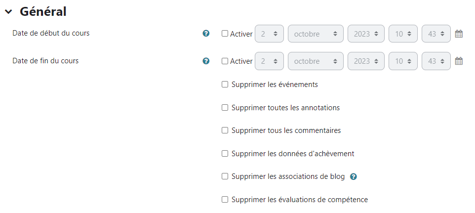 Date de début et de fin de cours : Il est possible de déterminer les nouvelles dates de début et de fin de cours lors de la réinitialisation. Il suffit de de cocher la case "Activer" et de sélectionner la date à l'aide du menu déroulant. Les dates prédéterminés du cours (échéances, restrictions) seront reportées sur la même période.