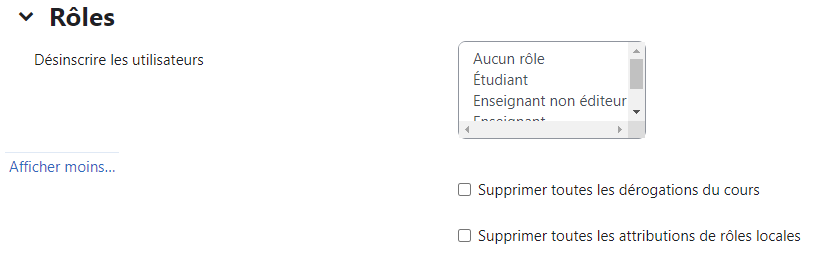 Permet la désinscription en lot les participants d'un cours selon le rôle. Pour sélectionner plus d'un élément à la fois, appuyez sur la touche clavier Maj / Shift et sélectionner les rôles.